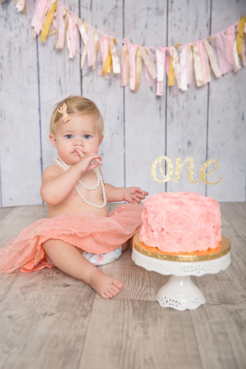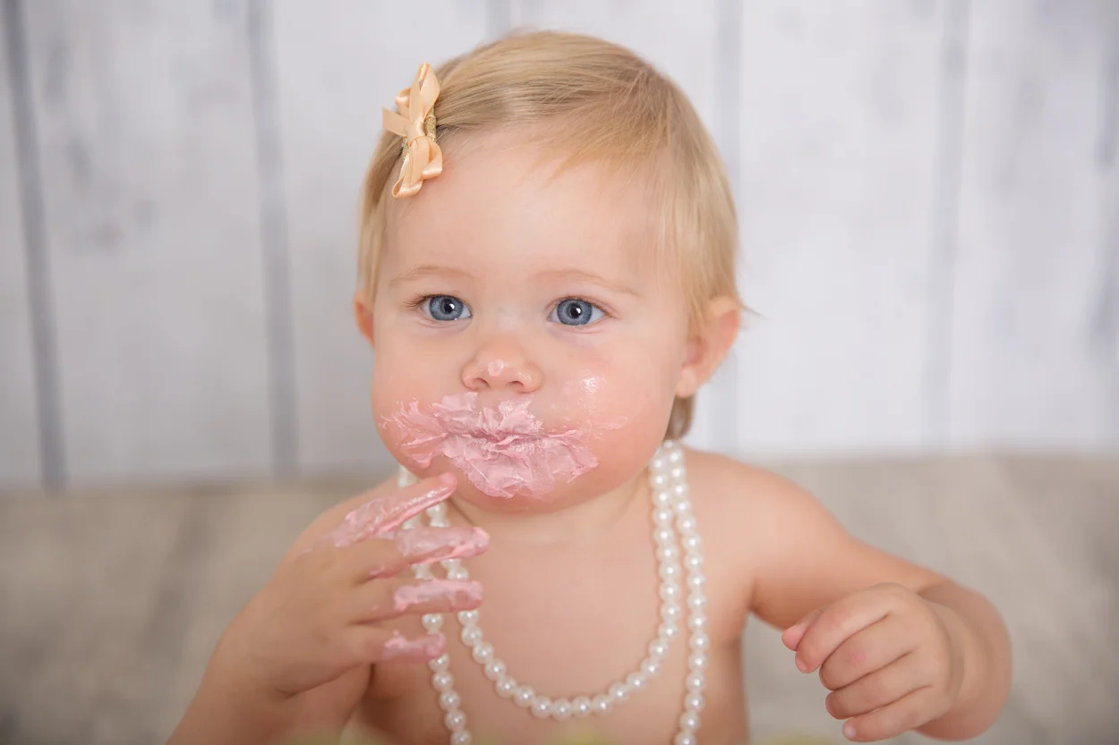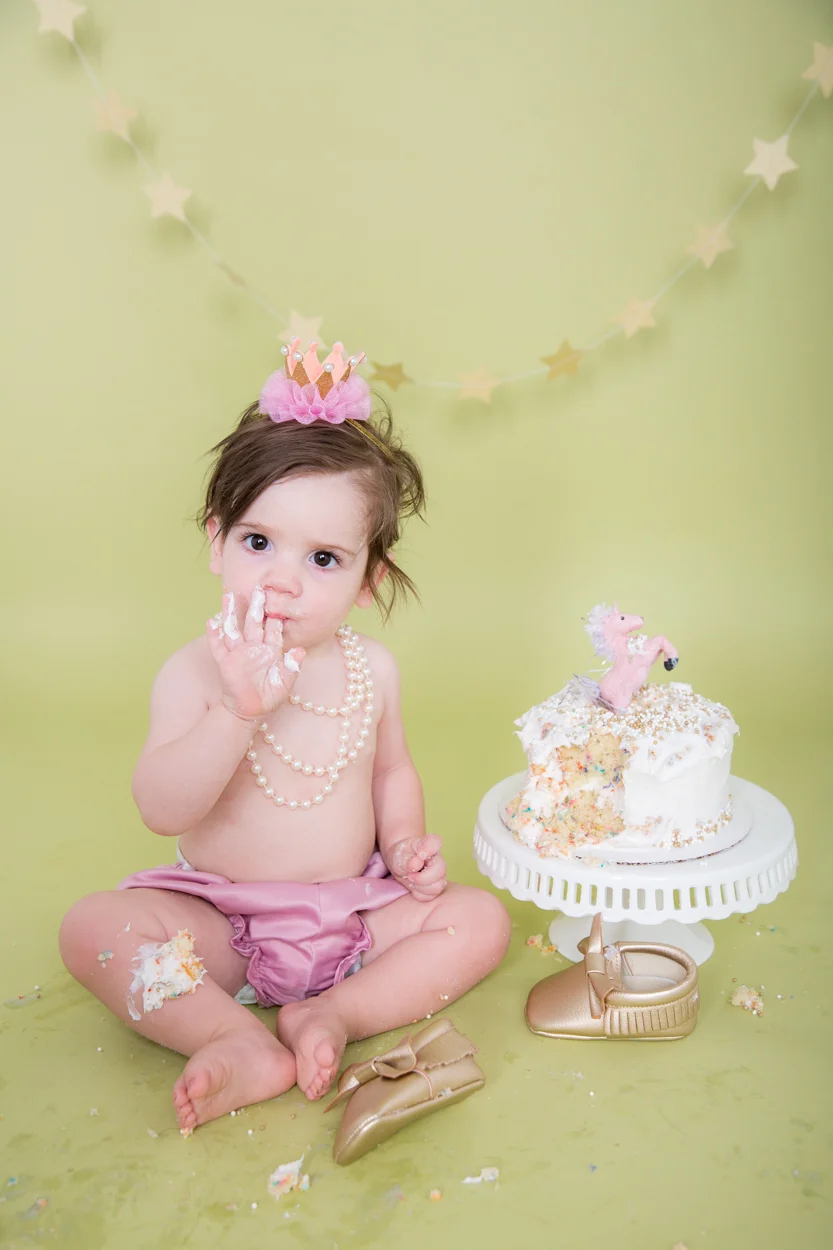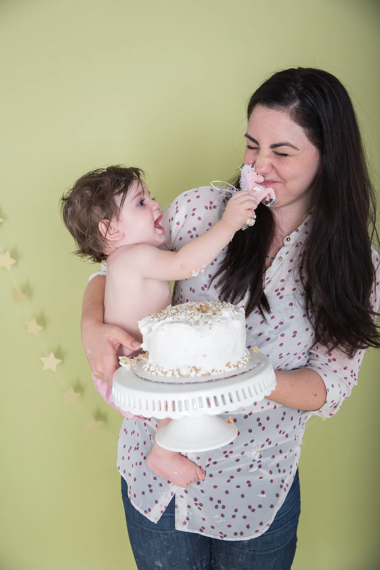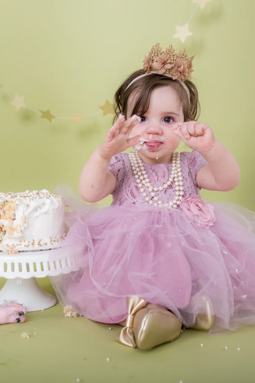 In this day and age, we celebrate a first birthday with the smashing of cake. These darlings are sometimes a bit confused at first, but mostly they quickly get the message and jump right in. With Olive below, you can see the progression from confused to smashing time, which I love! And in no time, she was mugging for the camera like a seasoned vet... and making sure mom was in on the fun.