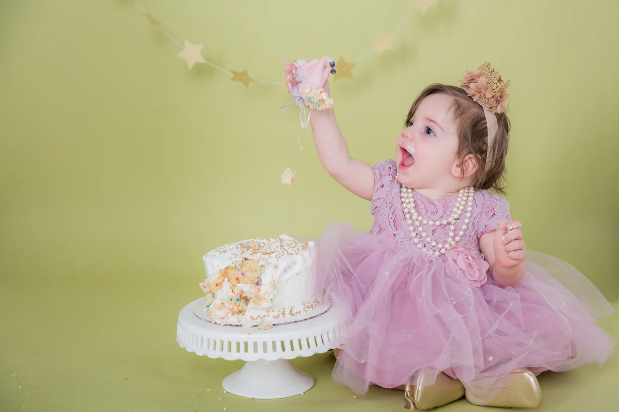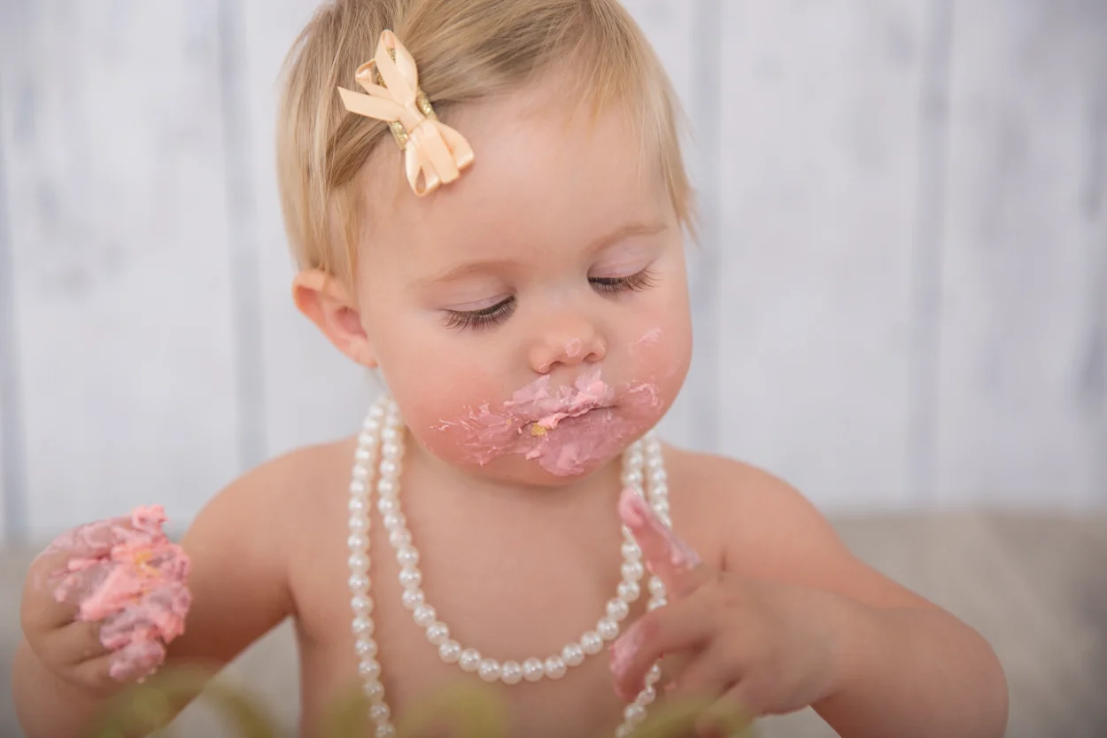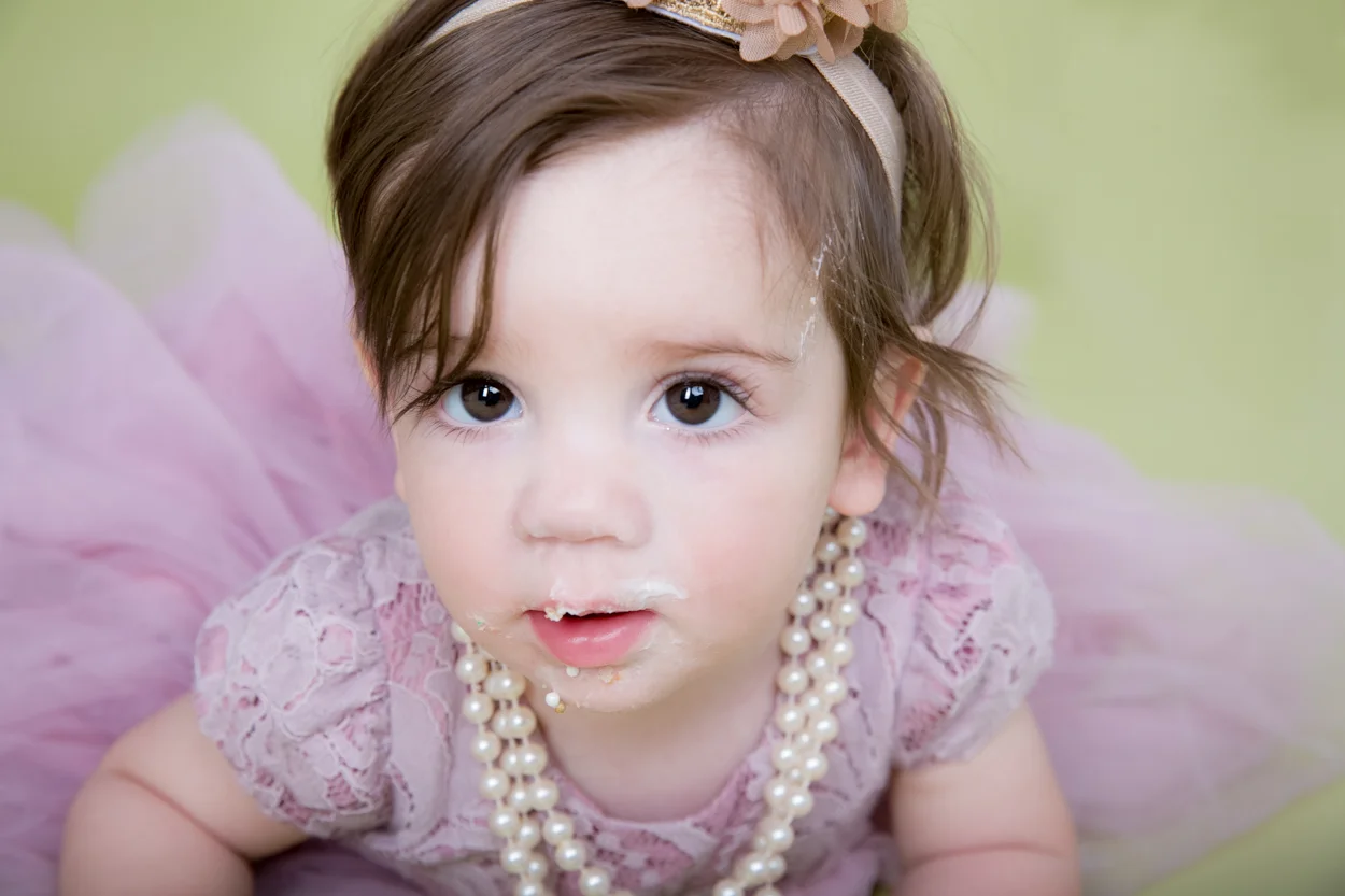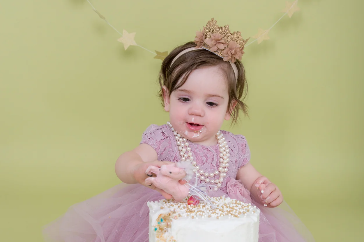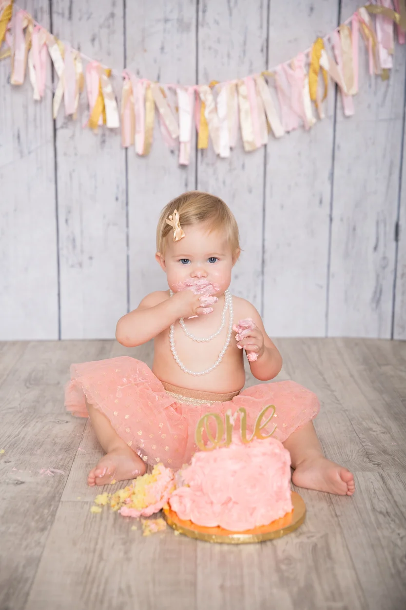 In this day and age, we celebrate a first birthday with the smashing of cake. These darlings are sometimes a bit confused at first, but mostly they quickly get the message and jump right in. With Olive below, you can see the progression from confused to smashing time, which I love! And in no time, she was mugging for the camera like a seasoned vet... and making sure mom was in on the fun.